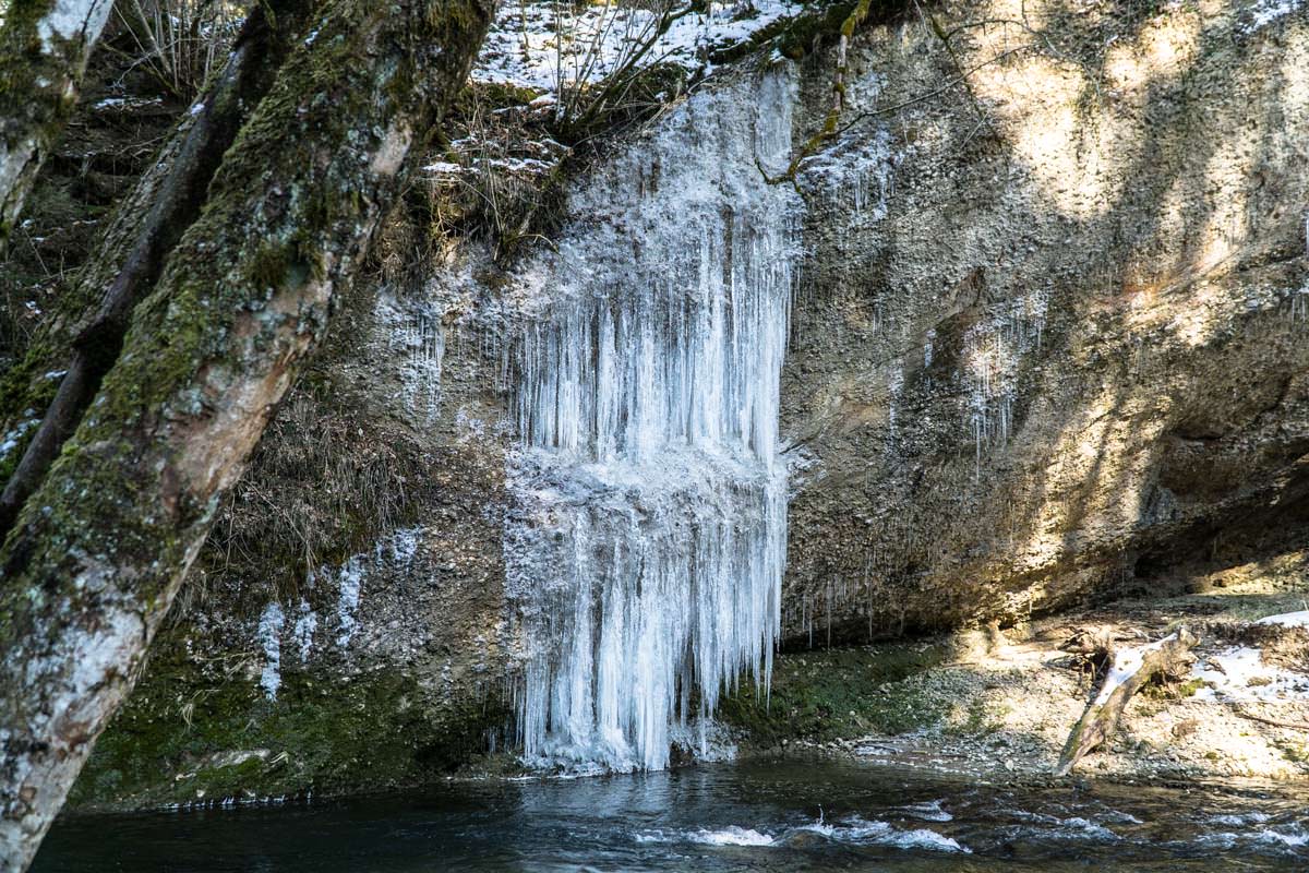 Etwa 10 Minuten hinter den ersten Wasserfällen kann man eines der Highlights des winterlichen Eistobels erkennen. Rechts oberhalb des Weges hat sich ein beeindruckender Eisvorhang an der Felswand gebildet. Das stetig herabtropfende Wasser ist in den letzten Frosttagen zu zahlreichen langen, dicken Eiszapfen gefroren. Der kurze, steile Weg zu dieser Eisgrotte ist im Schnee zwar recht mühsam, lohnt sich aber definitiv. Das Sonnenlicht lässt die kristallblauen, durchsichtigen Eiszapfen geradezu leuchten, während die etwas älteren gelblich-weißen Zapfen einen undurchsichtigen Eisvorhang bilden.
