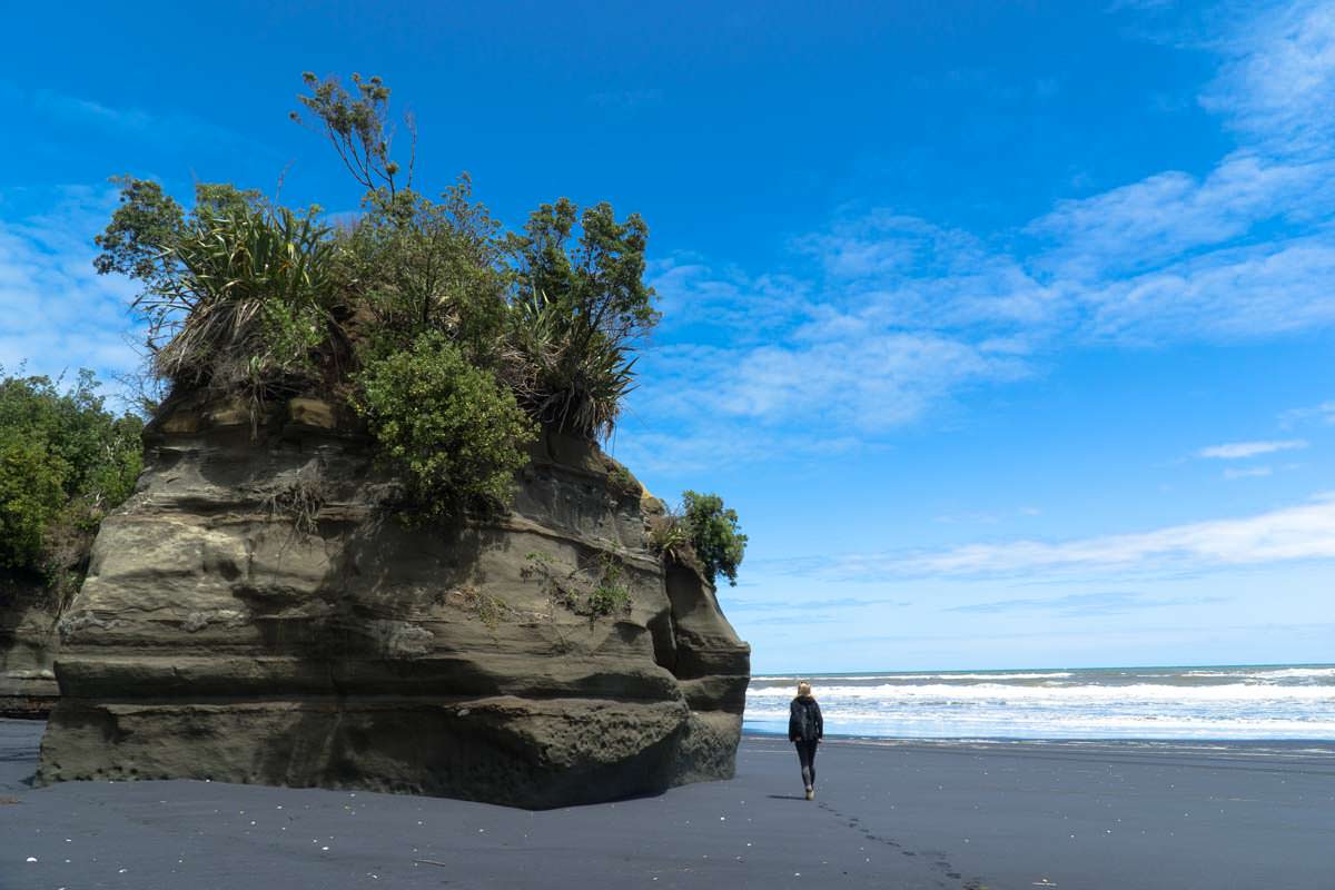 Die Strände von Awakino, Mokau und Tongaporutu sind nämlich nicht nur wunderbar einsam, sie besitzen auch eine Besonderheit: Quarzkristalle vulkanischen Ursprungs haben den Sand pechschwarz gefärbt. Nach der Flut glitzern diese schwarzen Sandstrände unberührt im Sonnenlicht und bilden einen faszinierenden Kontrast zur Gischt, dem blauen Himmel und der grün bewachsenen Küstenlinie. Außerdem gibt es hier bei Ebbe seltsam geformte Felsen, Wasserfälle und kleine Höhlen zu erforschen. Ihr wollt mehr erfahren? In unserem Reisebericht erzählen wir euch wo und wie ihr die wilden Strände bei Tongaporutu am besten entdecken könnt.