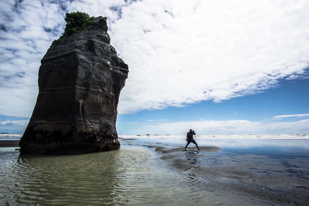 Mittlerweile hat die Ebbe ihren Höhepunkt erreicht. Wir fahren weiter nach Tongaporutu, da der Strand mittlerweile breit genug sein sollte, um die Three Sisters hautnah erleben zu können. Dort angekommen wechseln wir unsere Sneaker gegen Flip Flops, was gleich erstmal zu einem grandiosen Sturz von mir auf den mit Algen überzogenen Felsplatten führt. Laufen zählt diesen Urlaub wohl nicht gerade zu meinen Stärken… Zu meiner Verteidigung muss ich aber noch anmerken: es ist wirklich unglaublich rutschig und auch barfuß wird es nicht wesentlich besser!